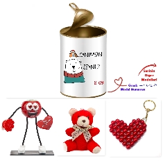 Ürün Detayları: Ürün kişiye özel olarak hazırlanmaktadır. Sevdiklerinizin yüzünü gülümseten bir sürpriz! Konsept hediye kutusu, hediye sepeti, kullanışlı içerikleriyle güzel bir seçenek oluşturmaktadır. Hediye kutusu içerisinde; 1 adet mesajlı çim adam, 1 adet peluş ayıcık ve 1 adet makrome kalp anahtarlık bulunmaktadır. Sade ama aynı anda dikkat çekici konserve kutusu içinde sunulan hediyeler ilginç ve farklı hediye arayanlar için ideal bir seçenektir. Sevdiklerinizi mutlu eden onları gülümseten bir hediyedir. Romantik, sevgi, aşk temalı dış tasarıma ait hediye seti, sevimli ve kullanışlı içerikleriyle her anı özel kılmaktadır. Ürünü ön plana çıkaran özelliği ise 14 Şubat Hediyesi, Sevgililer Günü Hediyesi, Doğum Günü Hediyesi, Kadınlar Günü Hediyesi, Sevgiliye hediye, Kız Arkadaşa Hediye, Erkek Arkadaşa, Sevgiliye Yılbaşı Hediyesi, Yeni Yıl hediyesi gibi klasik özel günlerde alınabileceği gibi kankaya, eşe, kız arkadaşa veya yakın arkadaşına içimden geldi, seni seviyorum demek için de yıl boyunca alınabilecek alternatif bir hediye olması hediye arayanlar için idealleştirmektedir.