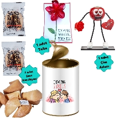 Ürün Detayları: Ürün kişiye özel değildir. Görseldeki tasarım hazırlanmaktadır. Sevdiklerinizin yüzünü gülümseten bir sürpriz! Konsept hediye kutusu, hediye sepeti, kullanışlı içerikleriyle güzel bir seçenek oluşturmaktadır. Hediye kutusu içerisinde; 1 adet toka, 1 adet çim adam ve 2 adet şans kurabiyesi bulunmaktadır. Şans kurabiyeleri ambalajlı olup taze SKT tarihi, ürün içeriği ambalaj üzerinde de görünmektedir. İçerisinden mutlu edecek eğlenceli dilekler, motivasyon mesajları bulunmaktadır. Karışık olarak gönderilmektedir. Sade ama aynı anda dikkat çekici konserve kutusu içinde sunulanmini hediyeler ilginç ve farklı hediye arayanlar için ideal bir seçenektir. Sevdiklerinizi mutlu eden onları gülümseten bir hediyedir. Romantik, sevgi, aşk temalı dış tasarıma ait hediye seti, sevimli ve kullanışlı içerikleriyle her anı özel kılmaktadır. Ürünü ön plana çıkaran özelliği ise 14 Şubat Hediyesi, Sevgililer Günü Hediyesi, Doğum Günü Hediyesi, Kadınlar Günü Hediyesi, Sevgiliye hediye, Kız Arkadaşa Hediye, Erkek Arkadaşa, Sevgiliye Yılbaşı Hediyesi, Yeni Yıl hediyesi gibi klasik özel günlerde alınabileceği gibi kankaya, eşe, kız arkadaşa veya yakın arkadaşına içimden geldi, seni seviyorum demek için de yıl boyunca alınabilecek alternatif bir hediye olması hediye arayanlar için idealleştirmektedir.